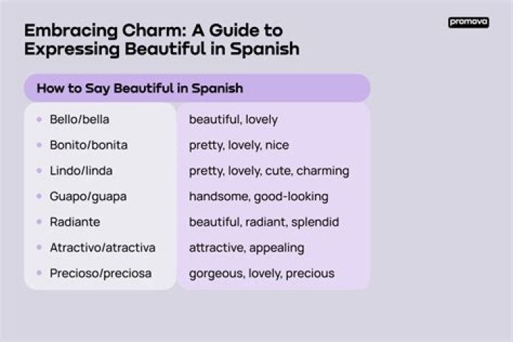 Bello/a – Beautiful A closely related noun is la belleza, which means “beauty.” This is a romantic and common word to call a person “beautiful” in Spanish. ¡Te ves muy bella! You look very pretty!