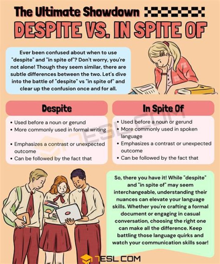 The easy answer: none. Despite and in spite of, despite what you may have heard, work identically in a sentence. In other words, these two prepositions, in spite of what you may have heard, are basically identical. In most cases, both mean “notwithstanding,” “even though,” or “regardless of.”