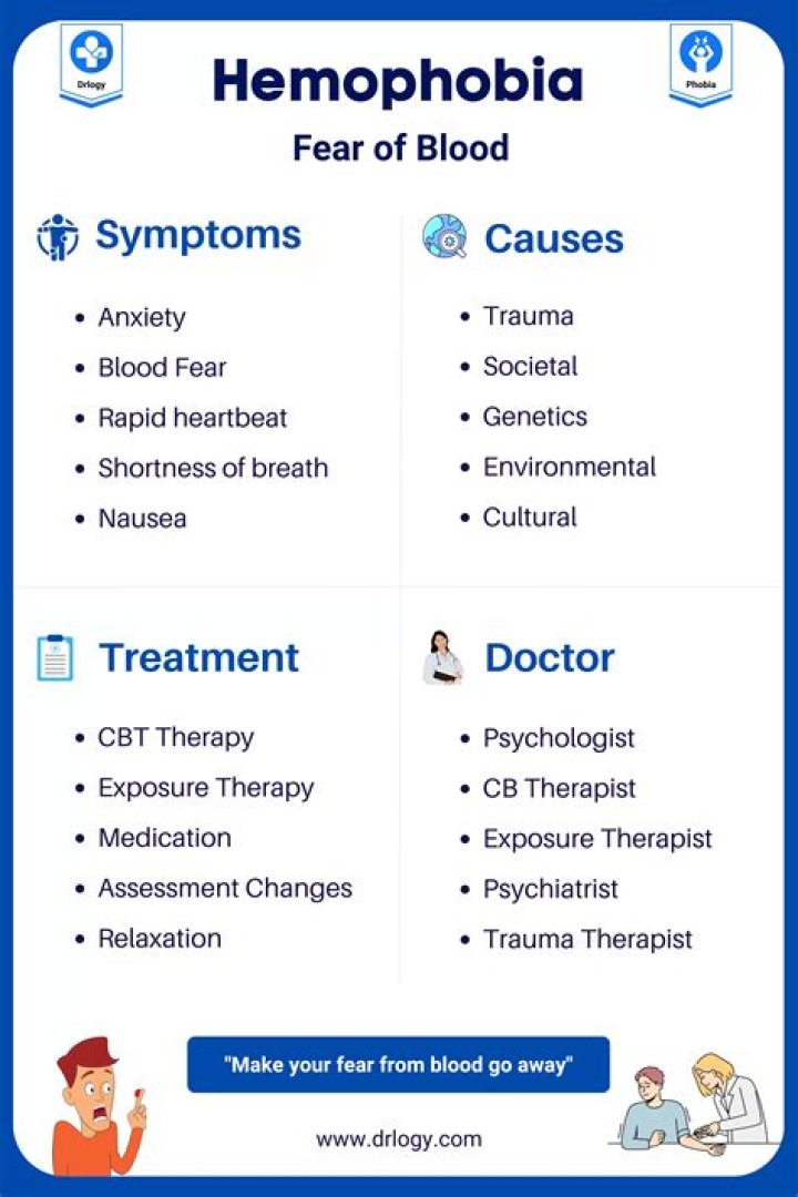 Hemophobia, or fear of blood, is a common specific phobia. The fear is categorized by the American Psychiatric Association’s Diagnostic and Statistical Manual as part of the subtype “blood-injection-injury” phobias.
