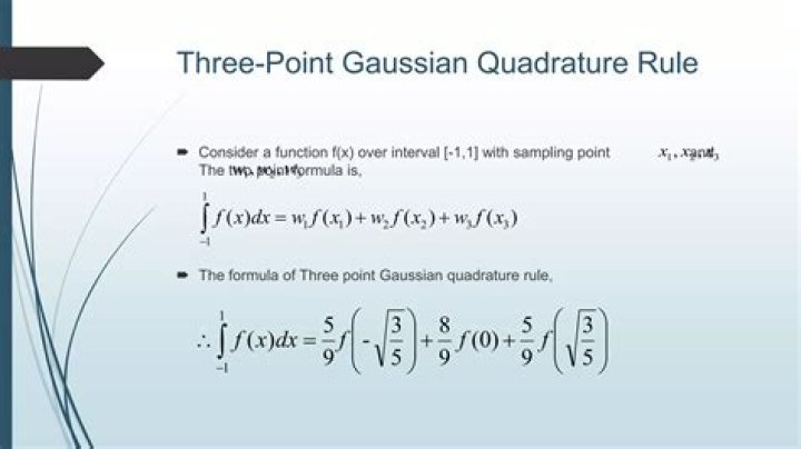 Gauss quadrature uses the function values evaluated at a number of interior points (hence it is an open quadrature rule) and corresponding weights to approximate the integral by a weighted sum. A Gauss quadrature rule with 3 points will yield exact value of integral for a polynomial of degree 2 × 3 – 1 = 5.