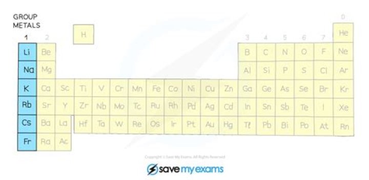 The alkali metals are six chemical elements in Group 1, the leftmost column in the periodic table. They are lithium (Li), sodium (Na), potassium (K), rubidium (Rb), cesium (Cs), and francium (Fr).